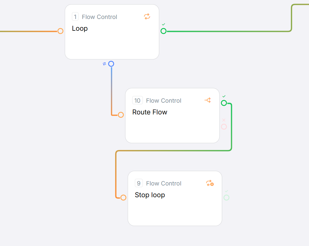| Loop never breaks | Stop loop stage not being reached in iterate path | Verify Stop loop is on the execution path; check Route Flow conditions |