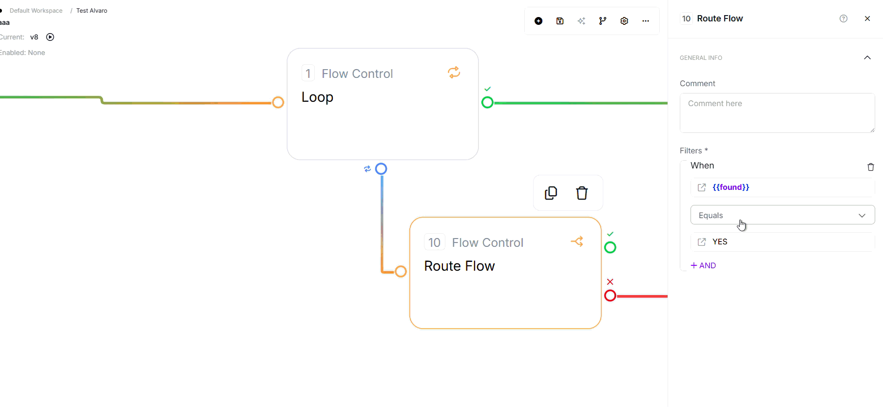 - Route Flow: {{found}} equals YES